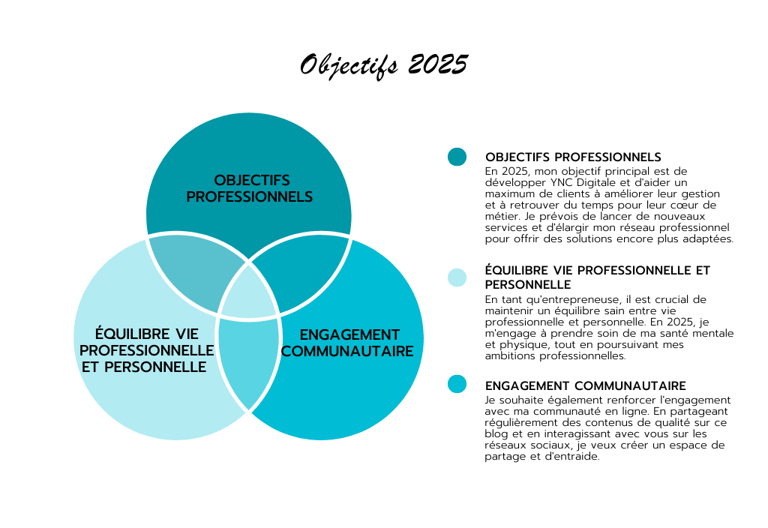 2024 a été une année de décisions et de changements, marquée par la création de YNC Digitale. En regardant vers 2025, je suis pleine d'espoir et de détermination pour atteindre mes objectifs et continuer à apprendre et à grandir. Je vous invite à partager vos réflexions sur l'année écoulée et vos résolutions pour 2025 dans les commentaires ci-dessous.