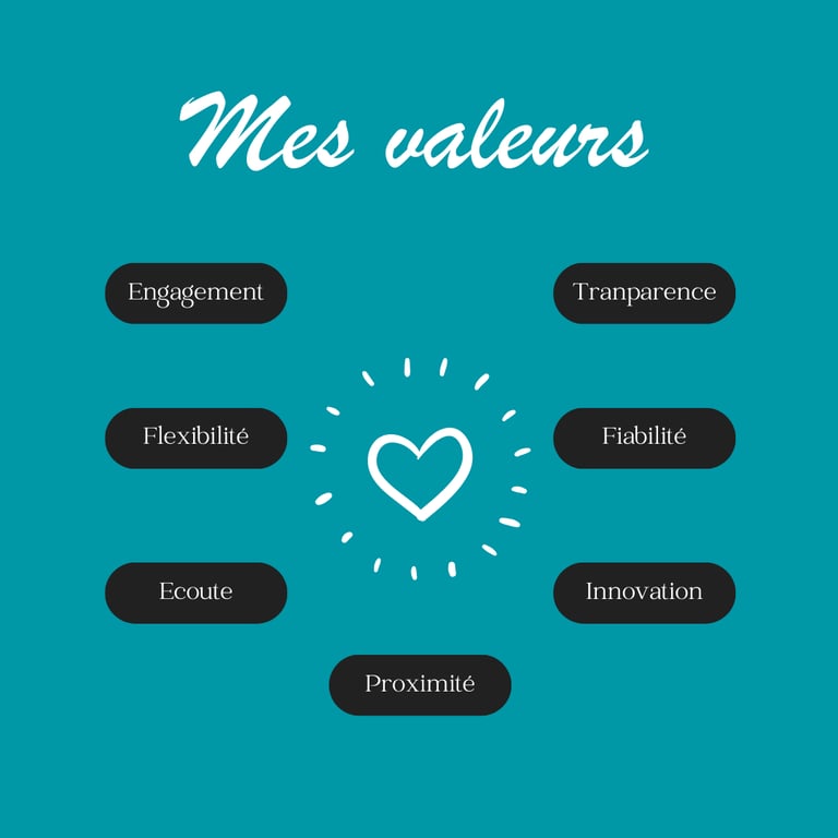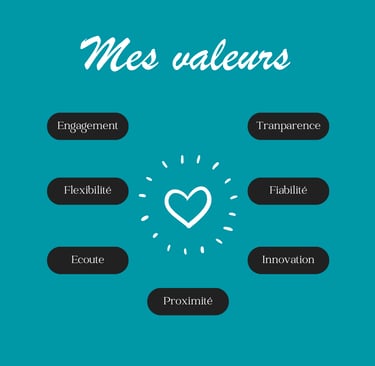 Ces valeurs témoignent de mon engagement à fournir un service de qualité et à établir une relation de confiance avec mes clients.